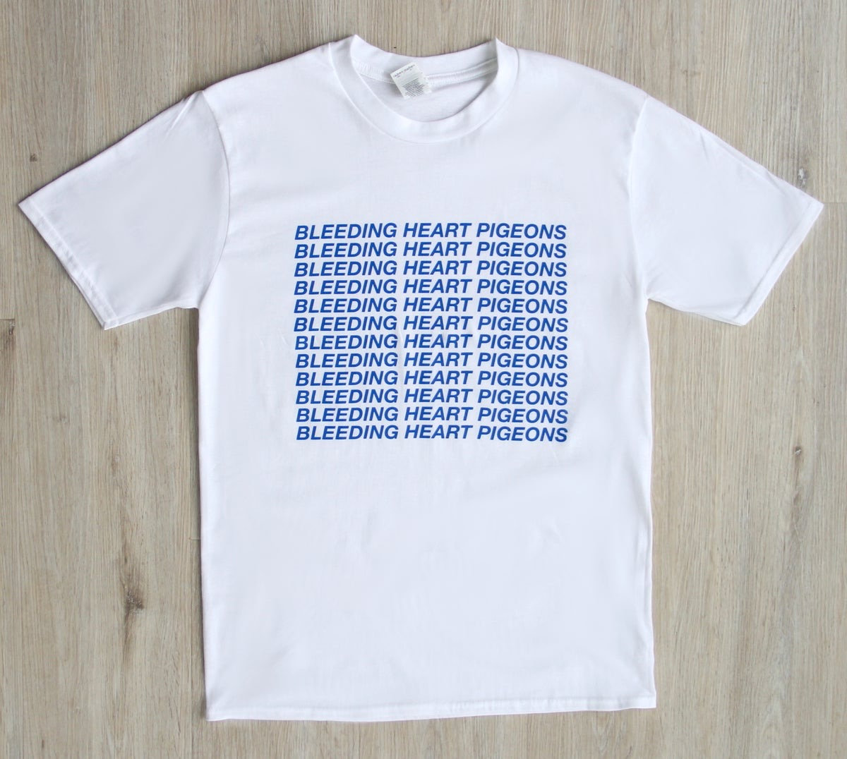 White Gildan Premium Cotton Tees with blue 'BLEEDING HEART PIGEONS' screenprint.
